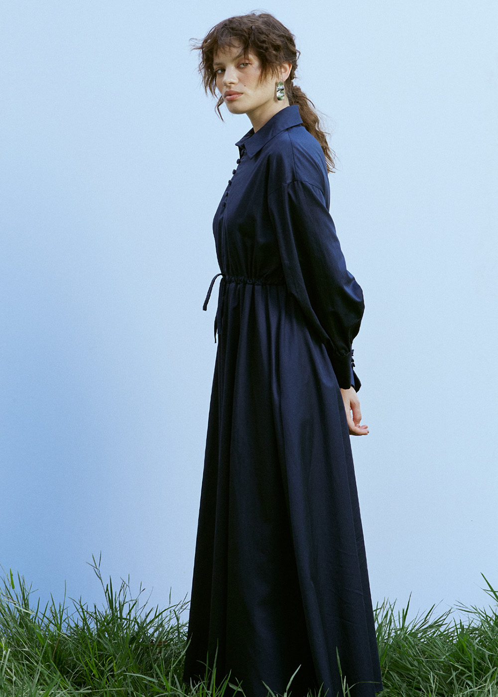 Gömlek yakalı, düşük kollu, brit düğme kapamalı, manşet kısmı brit düğmeli, beli bağcıklı, astarsız elbise.