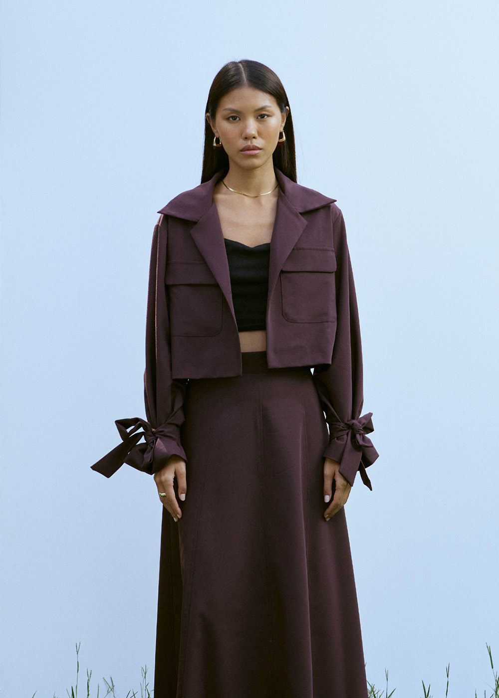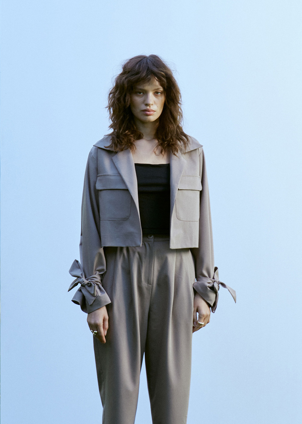 Ceket yaka, takma kollu, önden iki cep kapaklı, kol uçları kuşaklı, astarlı kısa ceket.