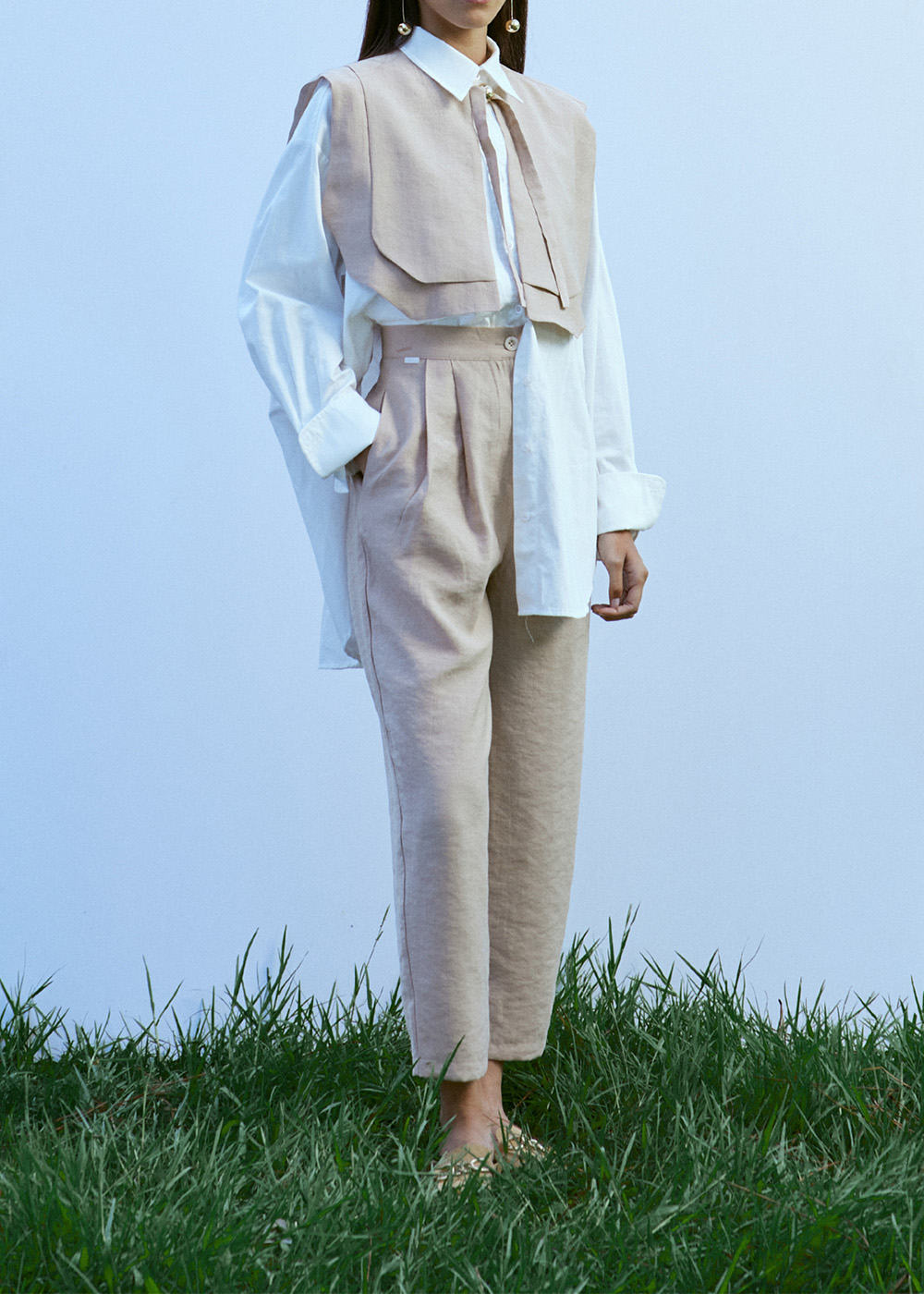 Fermuar kapamalı, yanlardan gizli cepli, önden pile detaylı pantolon.