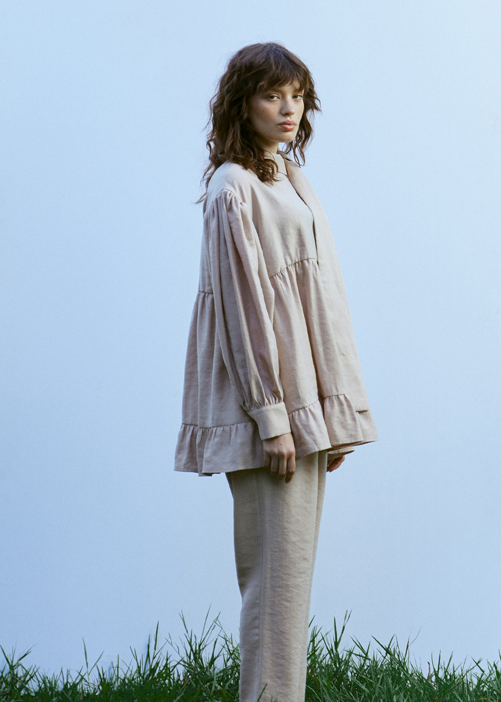 Yakası fiyonk detaylı, büzgülü, balon kollu, geniş manşetli, poplin kumaş gömlek.