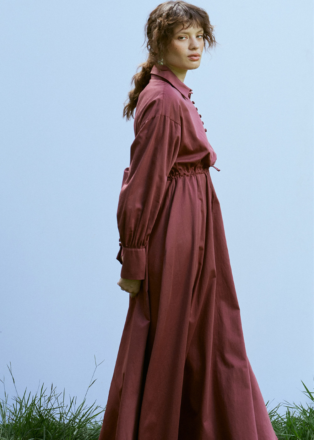 Gömlek yakalı, düşük kollu, brit düğme kapamalı, manşet kısmı brit düğmeli, beli bağcıklı, astarsız elbise.