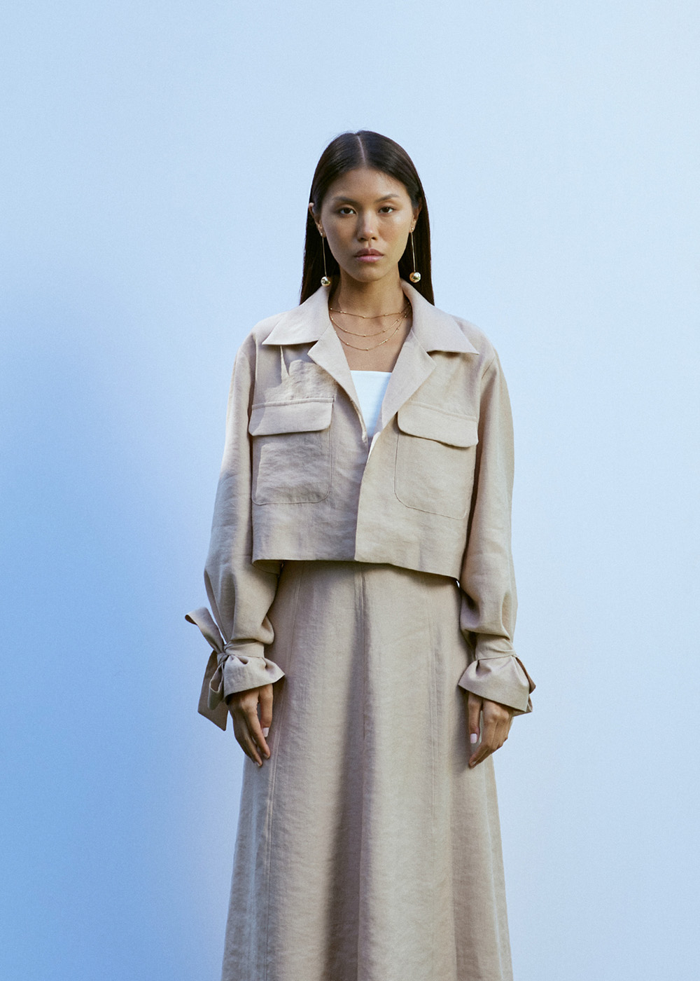Ceket yaka, takma kollu, önden iki cep kapaklı, kol uçları kuşaklı, astarlı kısa ceket.