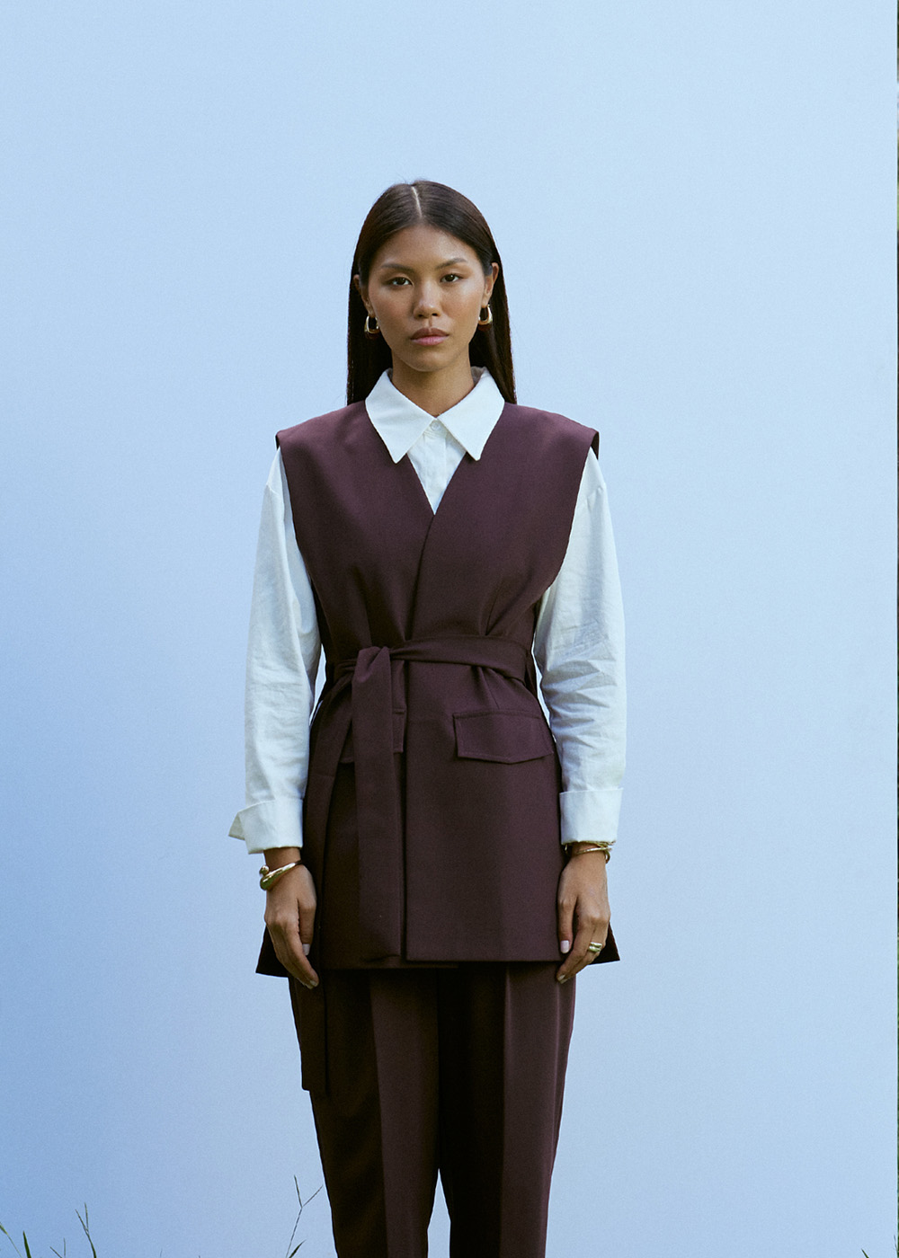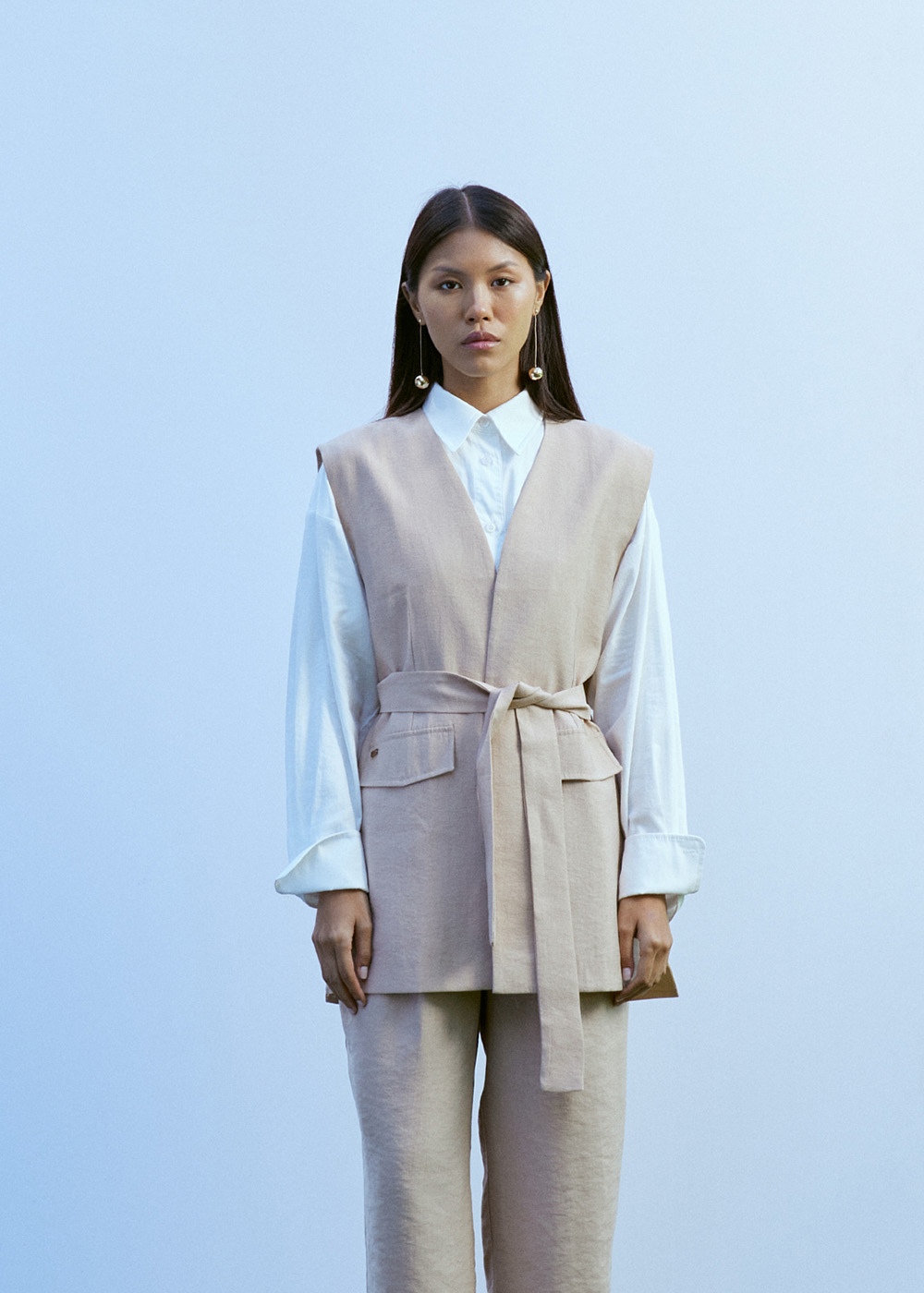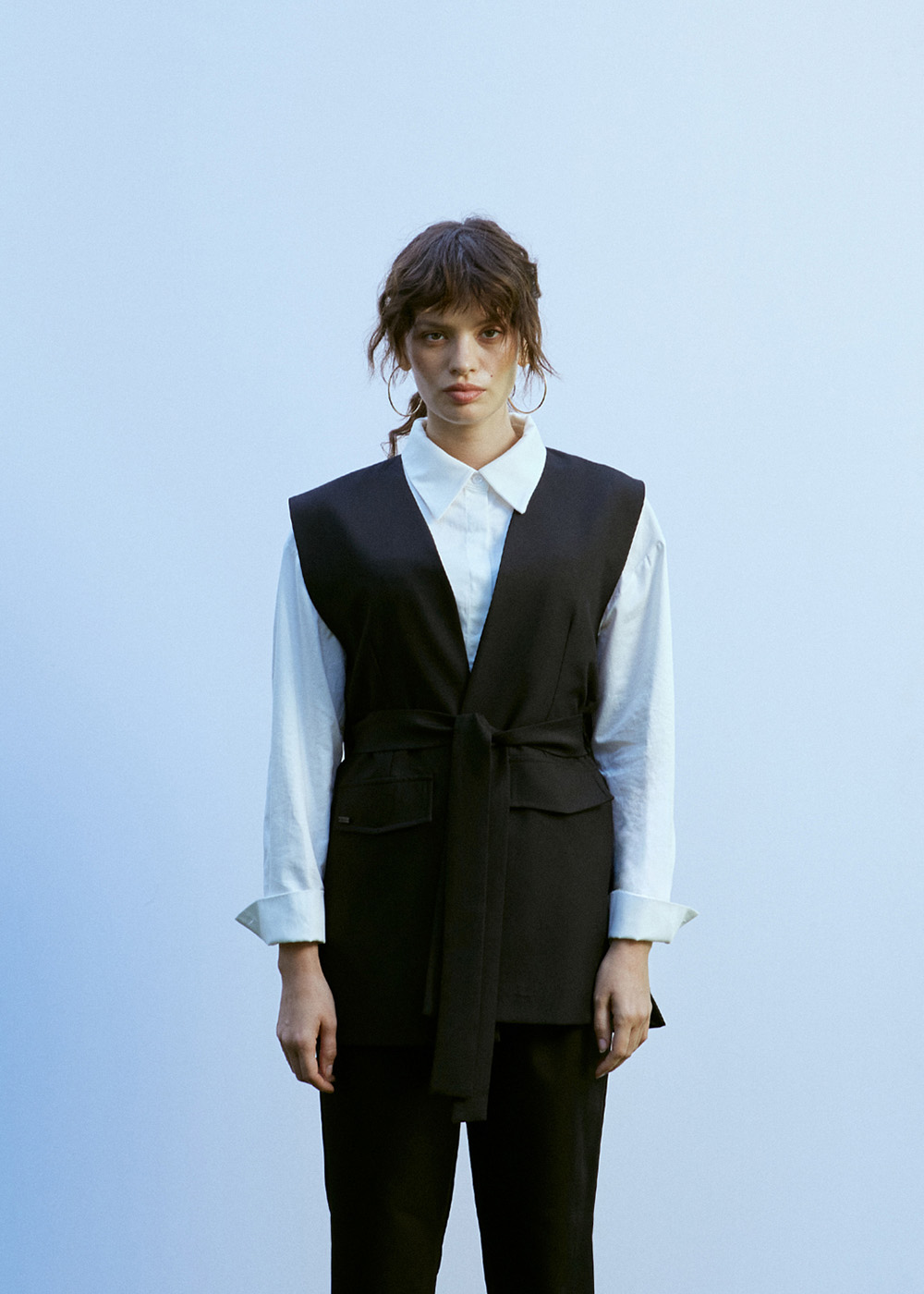 V yakalı, astarlı, süs cep kapaklı, yanlardan yırtmaçlı, seyyar kemerlidir.