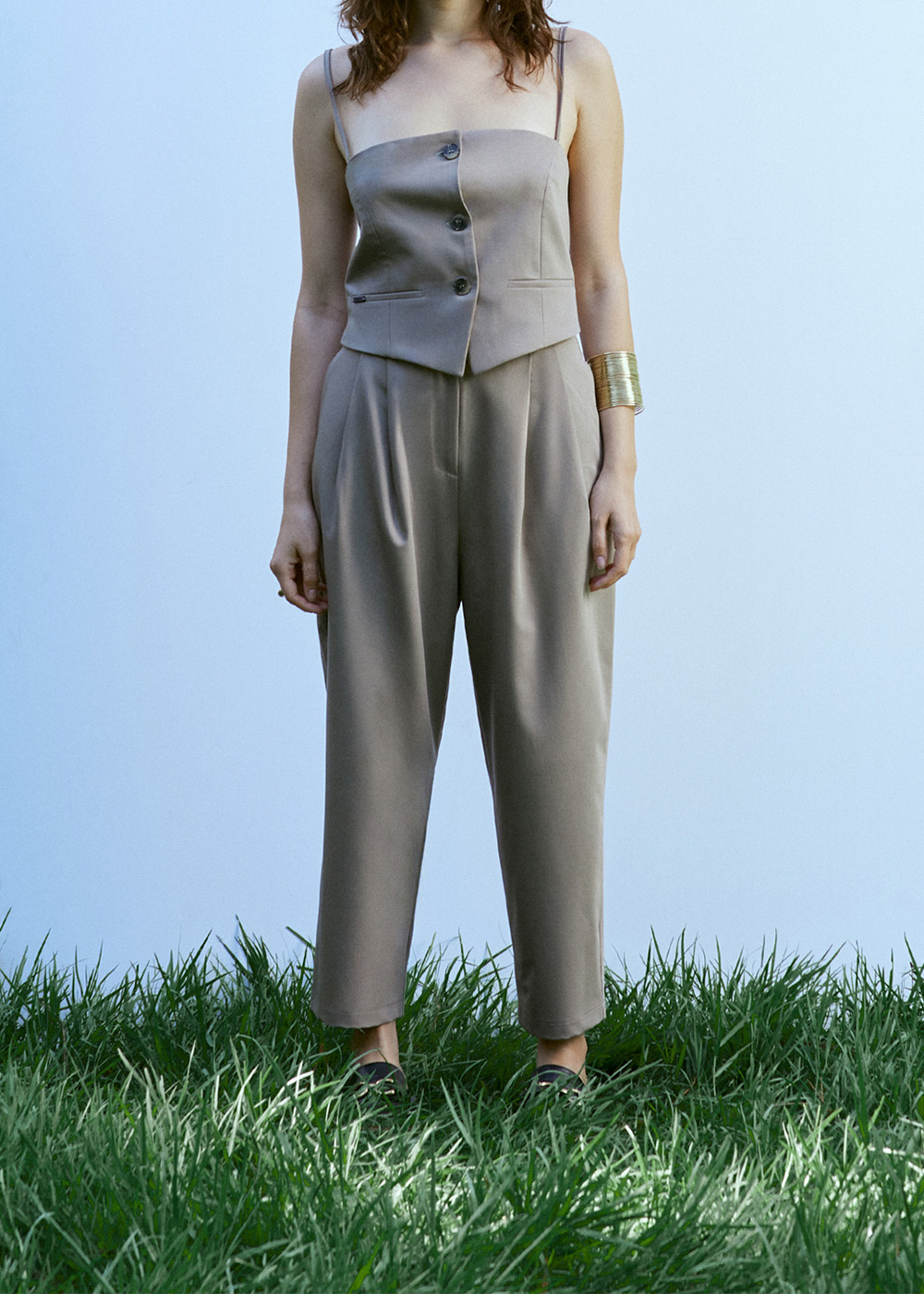 Fermuar kapamalı, yanlardan gizli cepli, önden pile detaylı pantolon.